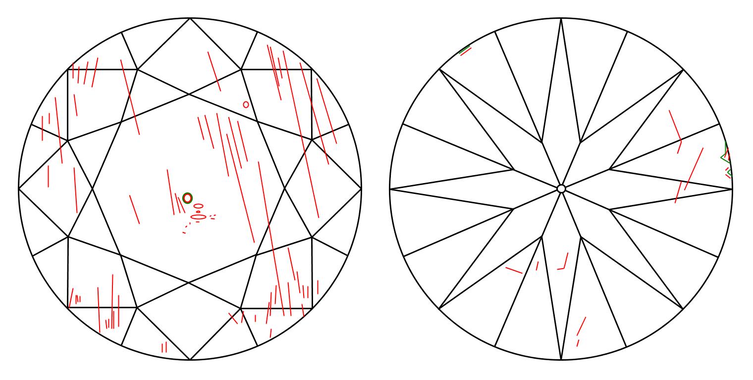 The position of an inclusion affects how easily it can be seen. Diamond cutters make every effort to cut a stone so that inclusions are not visible through the table of the finished diamond. The preferred position for inclusions is under the bezel facets or near the girdle because they are harder to see there.